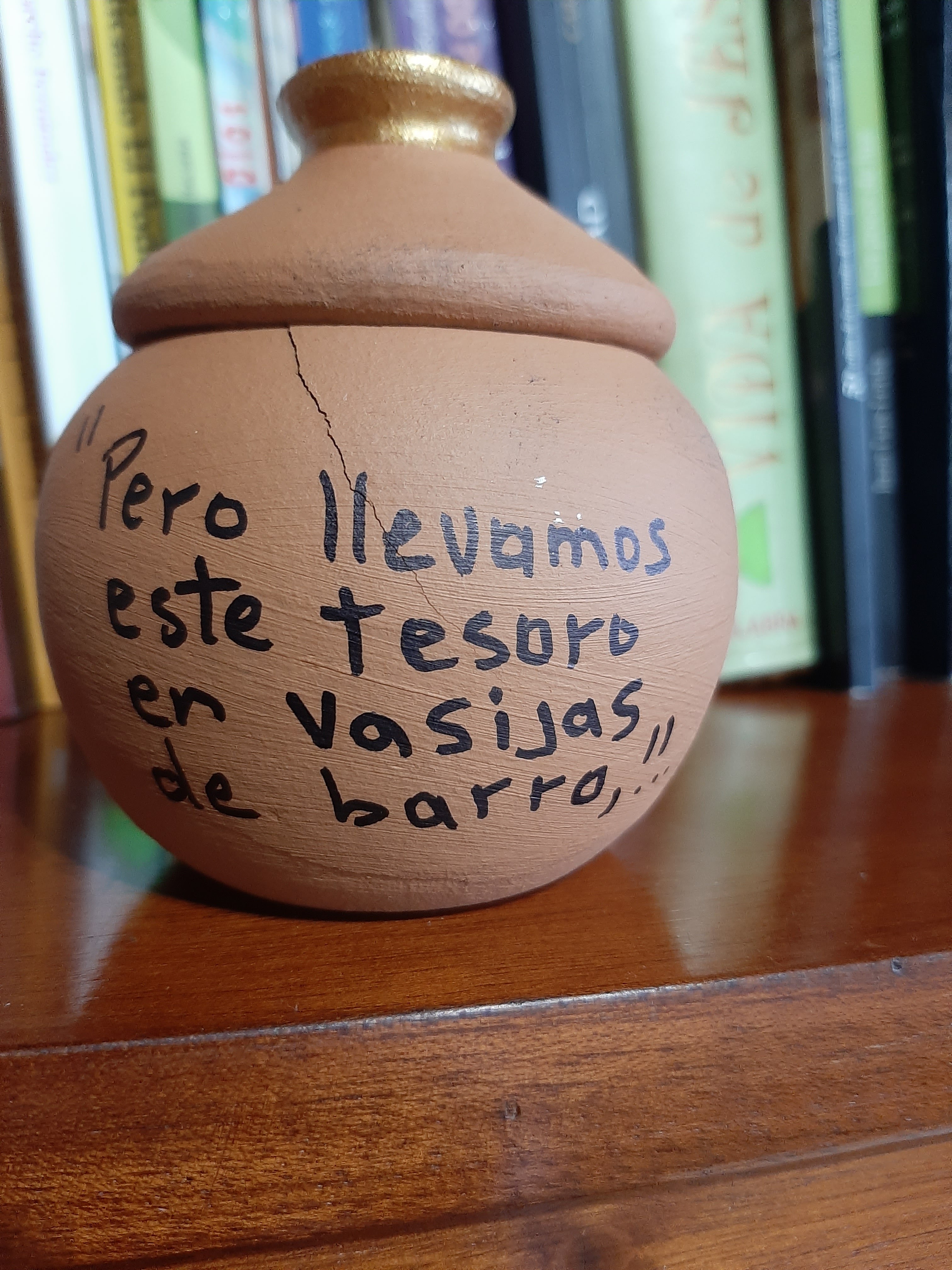 De recordatorio me dieron una pequeña vasija de barro -su pueblo es famoso por esas artesanías- y se cumplió lo que había escrito en ella, pues se me cayó y ha quedado con una gran raja